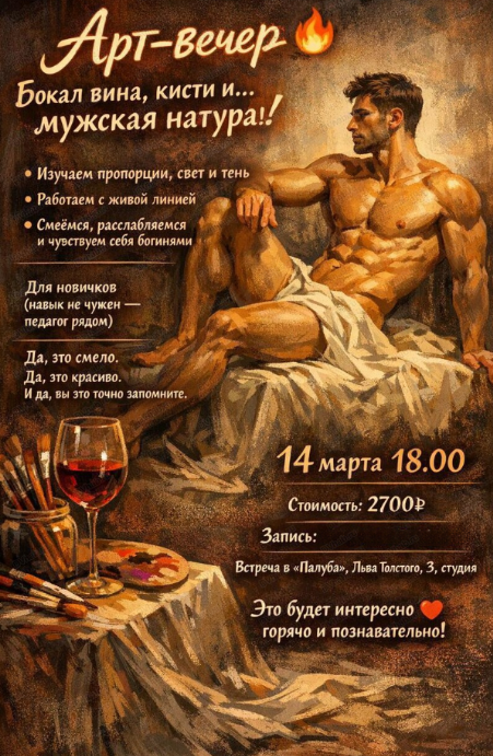 Вы зарегистрированы на событие «Арт вечер, рисование с мужской натуры с вином», на 14 марта 18:00