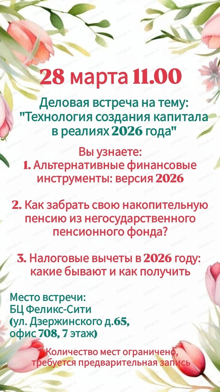 Вы зарегистрированы на событие «Деловая встреча "Технология создания капитала в реалиях 2026 года"», на 28 марта 11:00