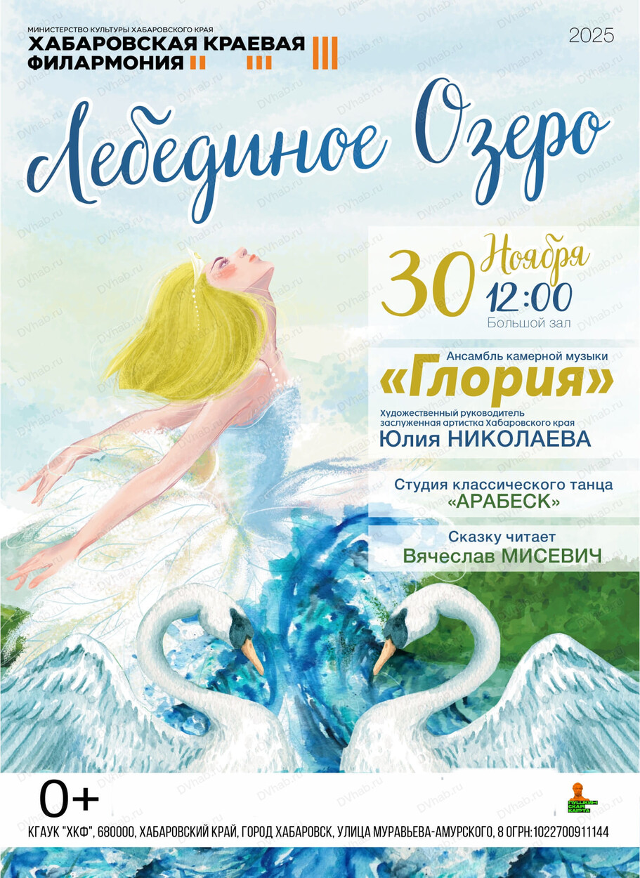Сказку читает Вячеслав Мисевич. Прозвучит музыка из балетов «Щелкунчик» и «Лебединое озеро» П.И. Чайковского.