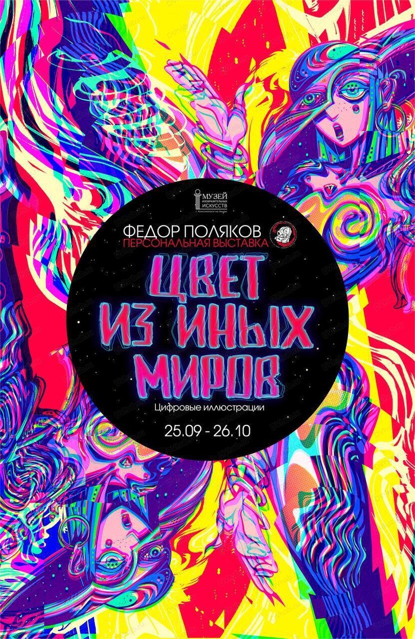 Произведения Федора Полякова знакомы каждому, кто хоть раз становился гостем Музея изобразительных искусств – автор выставки является художником-оформителем нашего музея. Яркие афиши выставочных проектов, современный дизайн экспозиций и цифровые модели выставок разрабатывает именно он. Однако в жизни художника остается место и для личного творчества: цифровые иллюстрации Федора Дмитриевича экспонировались в различных групповых выставочных проектах: «Преодоление времени» (Городской краеведческий музей, г.Комсомольск-на-Амуре, 2024), «Крылатые и Хвостатые» (Музей изобразительных искусств, г.Комсомольск-на-Амуре, 2024), «Краевая молодежная художественная выставка» (Картинная галерея им.А. М. Федотова, г.Хабаровск, 2024), «Молодежка» (Выставочный зал Союза художников, г.Комсомольск-на-Амуре, 2025).