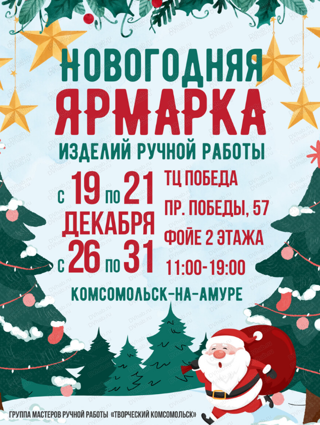 Жителей и гостей Комсомольска-на-Амуре приглашают на Новогоднюю ярмарку изделий ручной работы в ТЦ Победа, где вас будут ждать необычные подарки, сувениры, угощения и, конечно же, праздничное настроение.