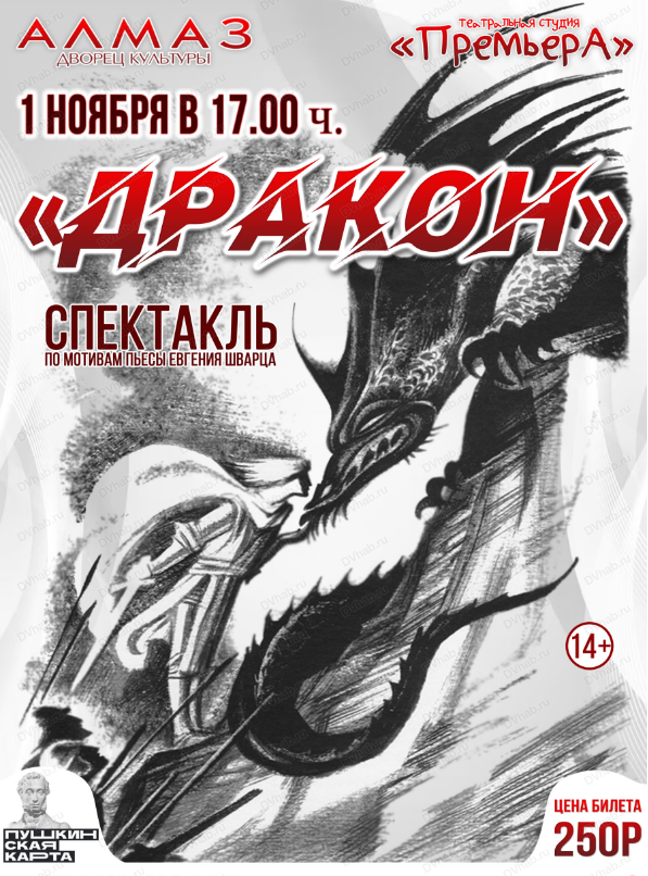 Театральная студия «ПремьерА» подготовила новый спектакль по мотивам пьесы Евгения Шварца «Дракон». Среди произведений писателя она является самой популярной для постановки на театральных подмостках. Чем же привлекает режиссёров и актёров «Дракон»? Кому-то интересна тема «Власть и человек», ведь пьеса написана в сложный период для нашей страны в 1943 году. Кого-то привлекает возможность воплотить на сцене психологически сложные характеры героев, их сломанные судьбы, их исковерканные души.