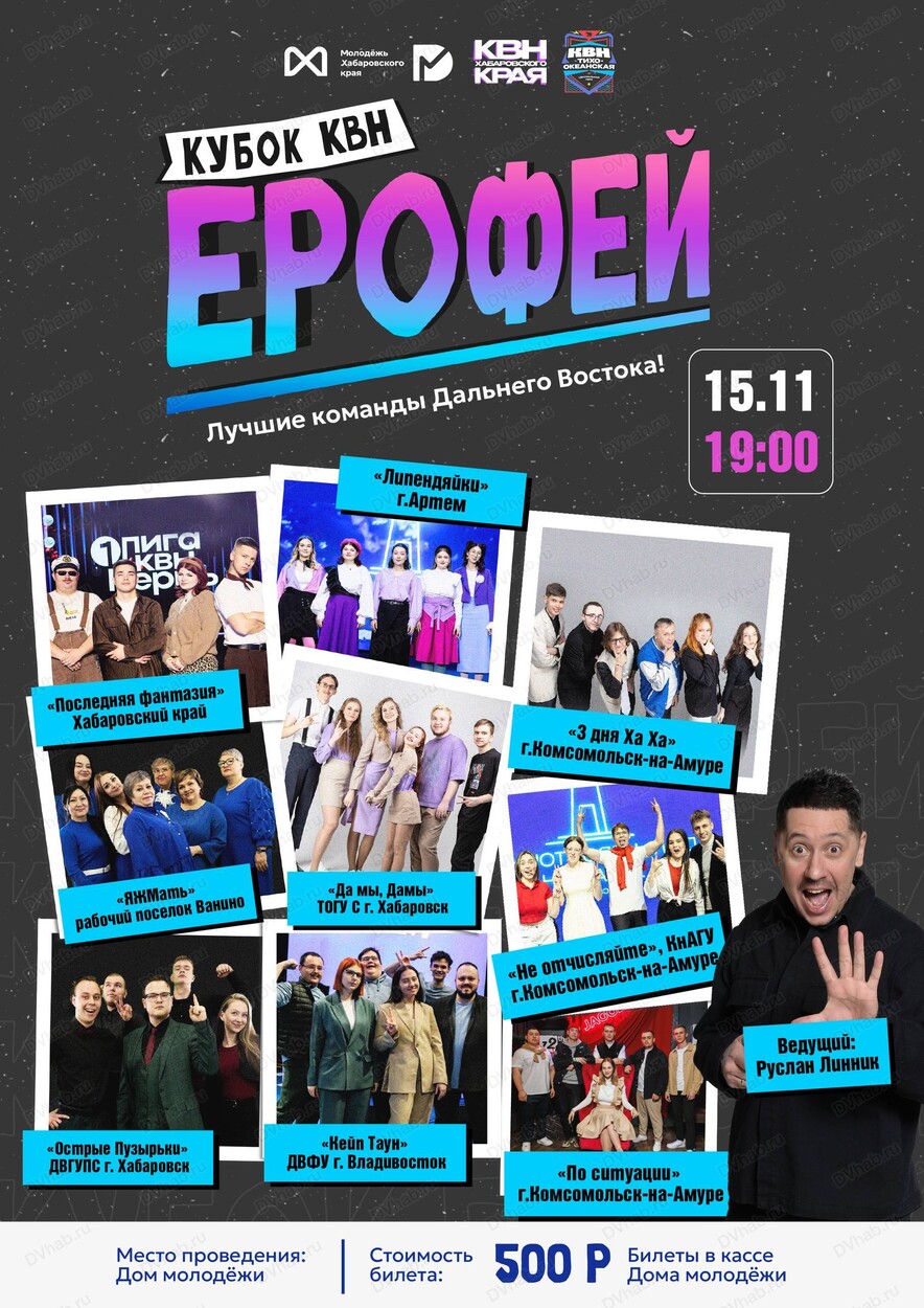 Яркое и незабываемое событие – встреча юмористов Дальнего Востока. Кубок приурочен к Международному дню КВН и впервые пройдет в Комсомольске-на-Амуре. Лучшие команды соберутся на одной сцене, чтобы побороться за главный трофей и зарядить зал энергией юмора и позитива.