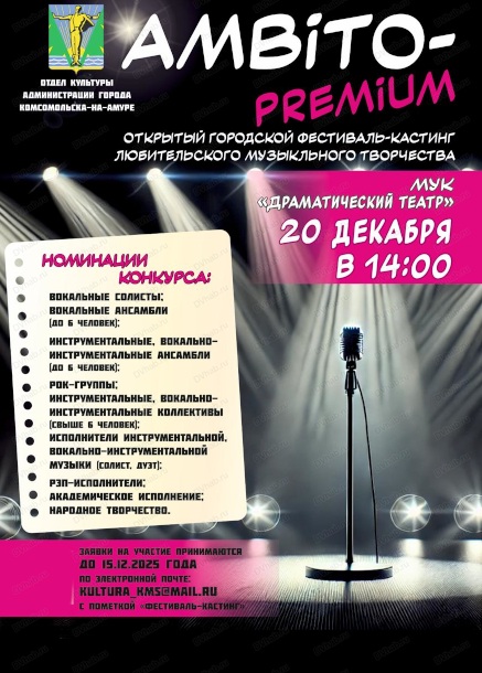 Отдел культуры администрации города Комсомольска-на-Амуре края приглашает комсомольчан и гостей города принять участие в Открытом городском фестивале-кастинге любительского музыкального творчества Аmbito-premium.