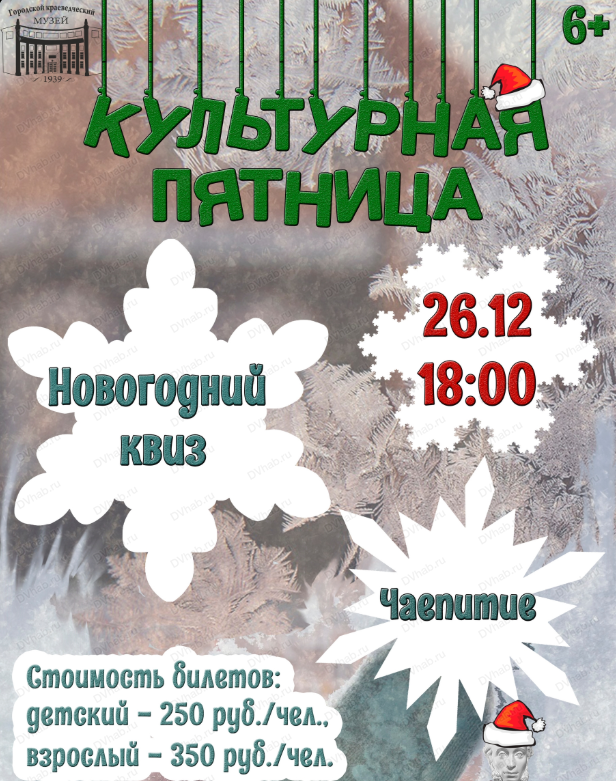 Проведите культурную пятницу в музее! Квиз - это командная интеллектуальная игра. Ответьте на вопросы о Хабаровском крае, городе, традициях и обычаях празднования Нового Года и получите приятный подарок! Проверьте себя и своих друзей, чтобы определить настоящего знатока.