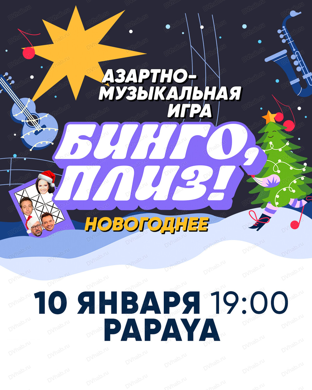 [Бинго, плиз!] — формат, который не требует от вас никаких музыкальных знаний. Здесь вы полагаетесь на удачу и надеетесь, что услышите исполнителей, написанных на вашем бланке. Расслабьтесь на нашей новогодней тусовке! Кстати, быстрее всех бинго собирает тот, кто хорошо себя вёл в уходящем году!
