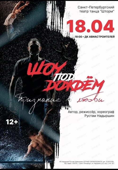 Санкт-Петербургский театр танца "Шторм" гарантирует, что зрители окунутся в бурю эмоций, и почувствуют безграничную силу танца. В финале номера исполняются под потоками воды!