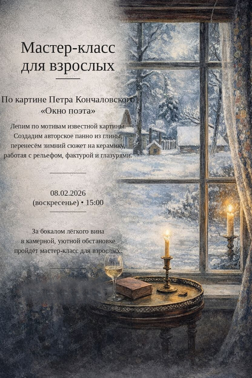 В гончарной мастерской "Волшебный мир глины" пройдёт творческий выходной, за бокалом лёгкого вина в уютной студии вы сможете создать авторское панно из глины по картине Петра Кончаловского "Окно поэта". Зима прекрасна своим снежным спокойствием и морозным очерованием.