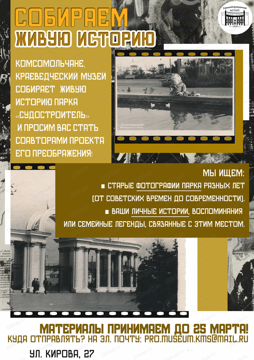Уважаемые комсомольчане, краеведческий музей собирает живую историю парка "Судостроитель" и просит вас стать соавторами проекта его преображения.