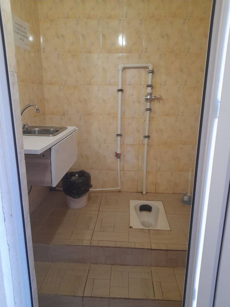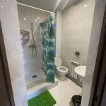 Душ с горячей и холодной водой, туалет, зеркало.