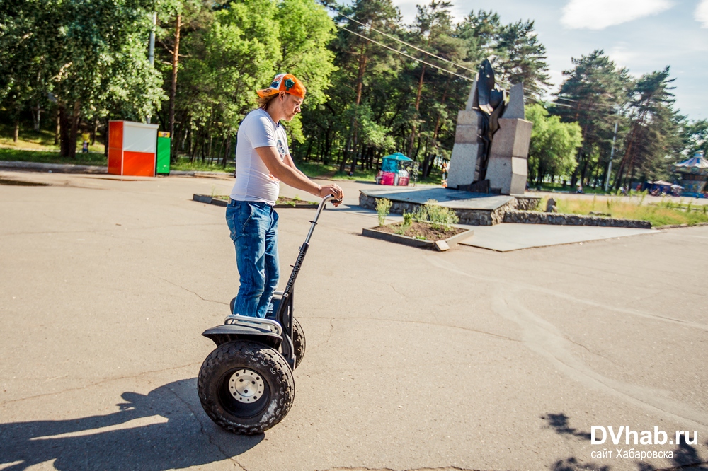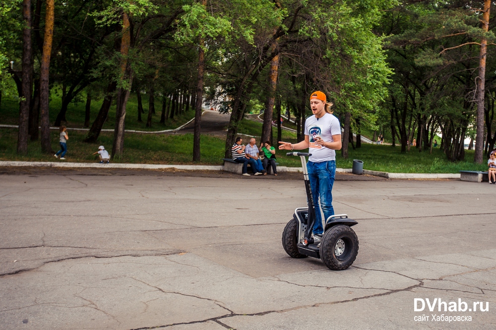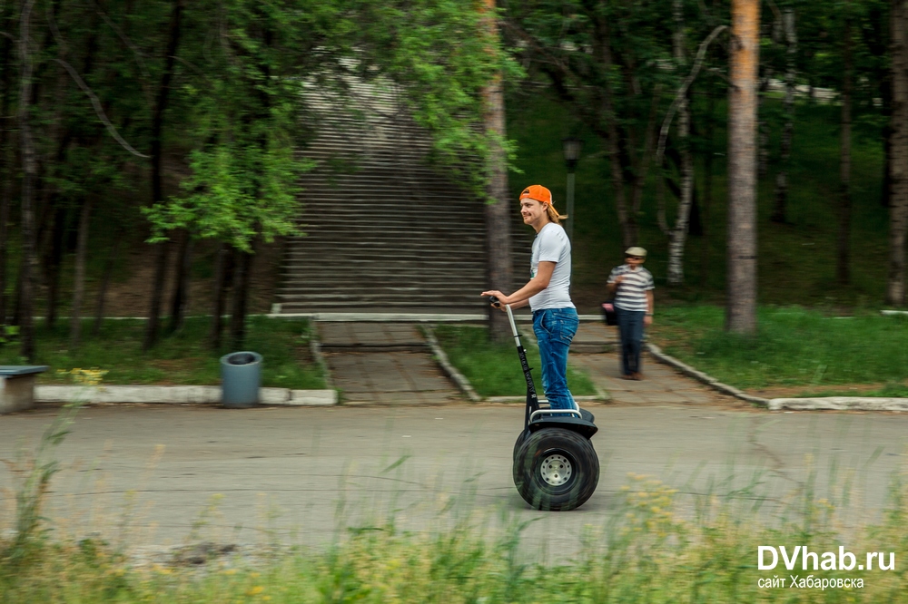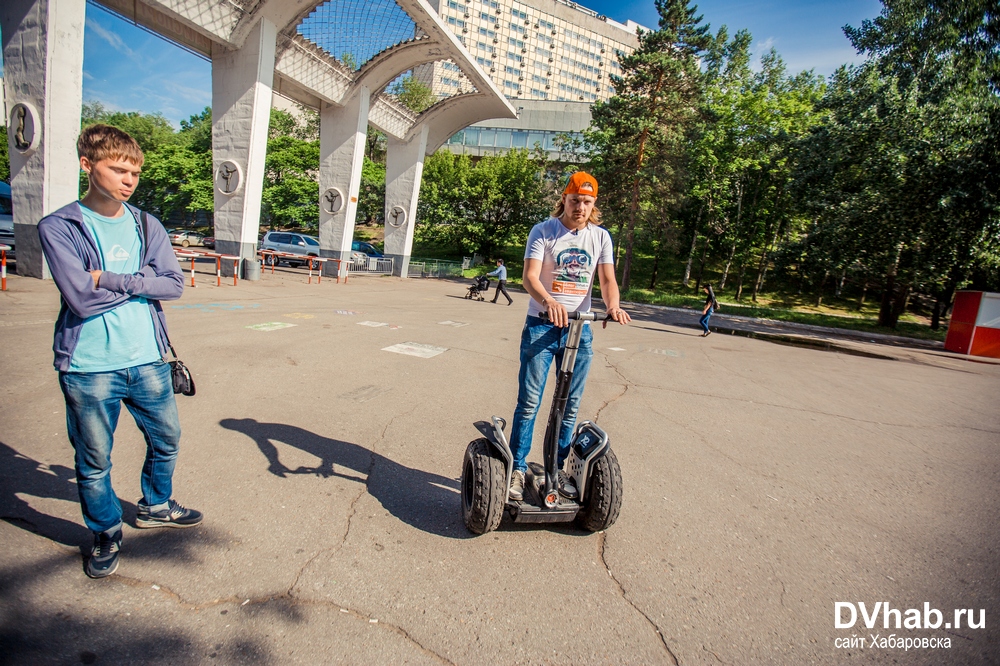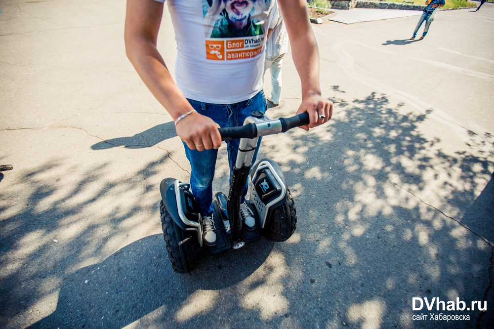 Сегвей заряжается от обычной розетки в течение 5 часов. Такй заряд расчитан на 4,5 часа непрерывной езды. Этого вполне хватило бы проехать весь Хабаровск. Между прочим, такой сегвей немного отличается от того, что придумывался в 2001 году. На данной модели, как мне рассказали, можно ездить не только по ровной поверхности, но и в гору, например.