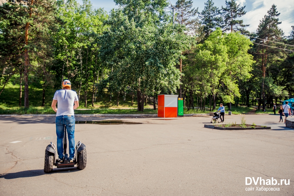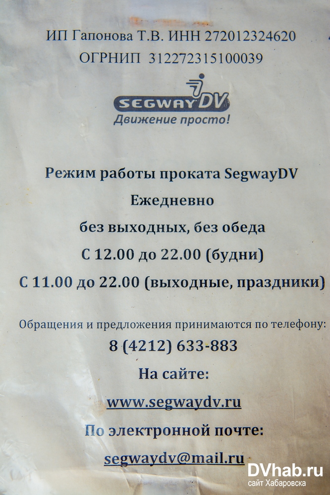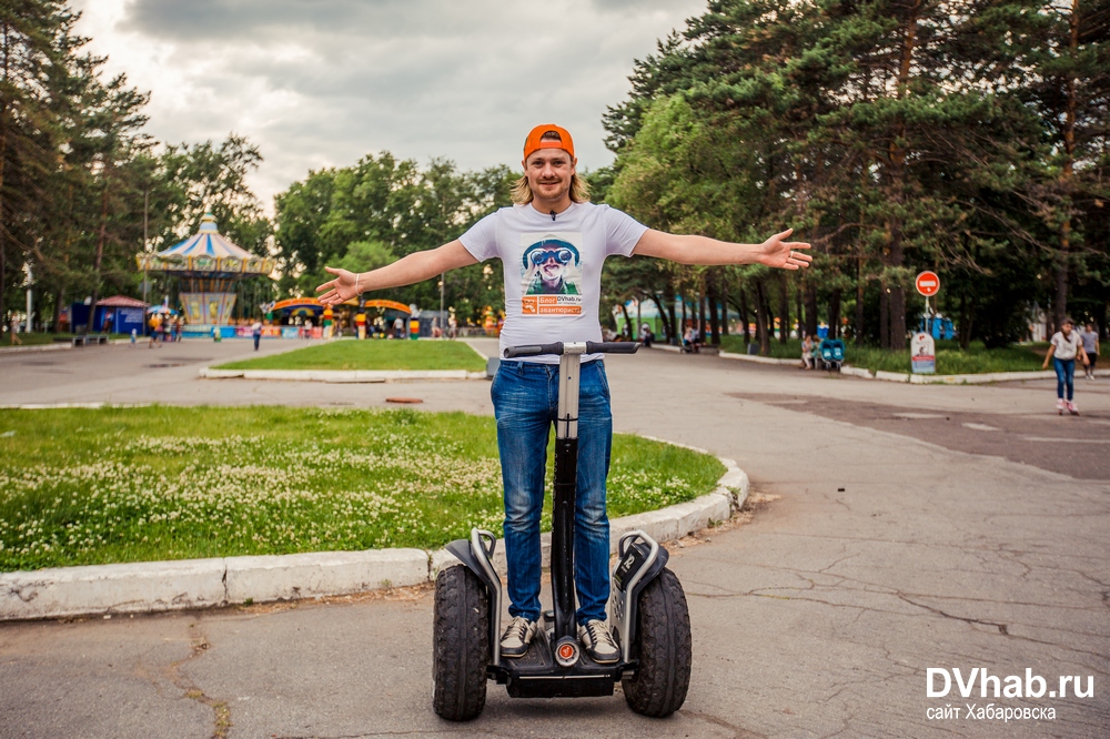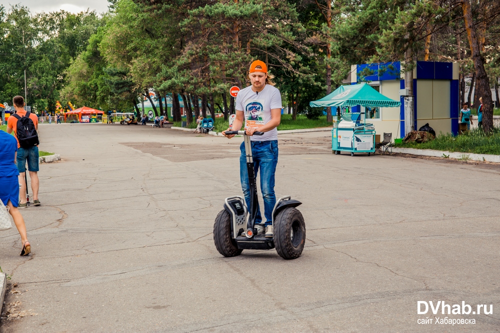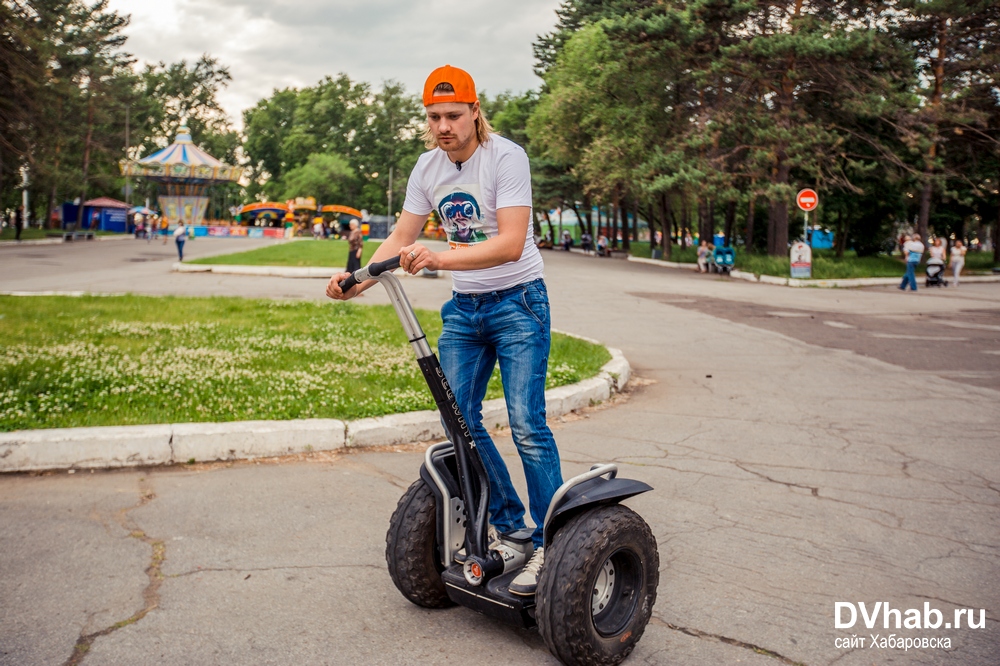 Сегвей заряжается от обычной розетки в течение 5 часов. Такй заряд расчитан на 4,5 часа непрерывной езды. Этого вполне хватило бы проехать весь Хабаровск. Между прочим, такой сегвей немного отличается от того, что придумывался в 2001 году. На данной модели, как мне рассказали, можно ездить не только по ровной поверхности, но и в гору, например.