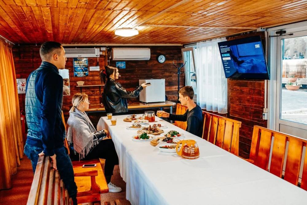 Питание организуется в кафе. На территории базы есть кафе "Роял" и кафе "Лайм".