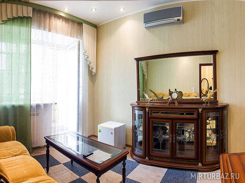 В номере категории "Люкс" (2‑комнатный): спальня - двуспальная кровать, платяной шкаф, телевизор; гостиная - мягкая мебель, комод, тумбочка, журнальный столик, холодильник, чайник, кондиционер; санузел (туалет, раковина, душевая кабина, холодная и горячая вода).