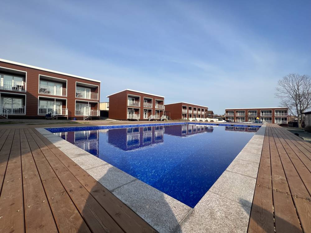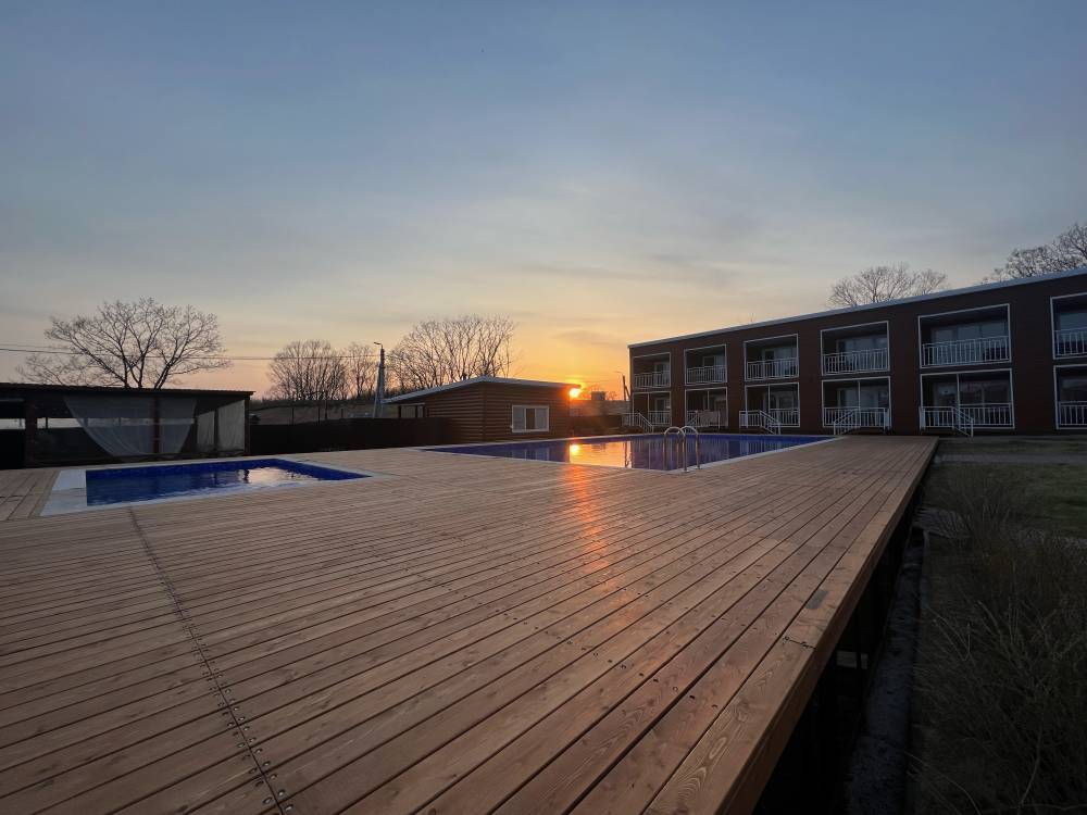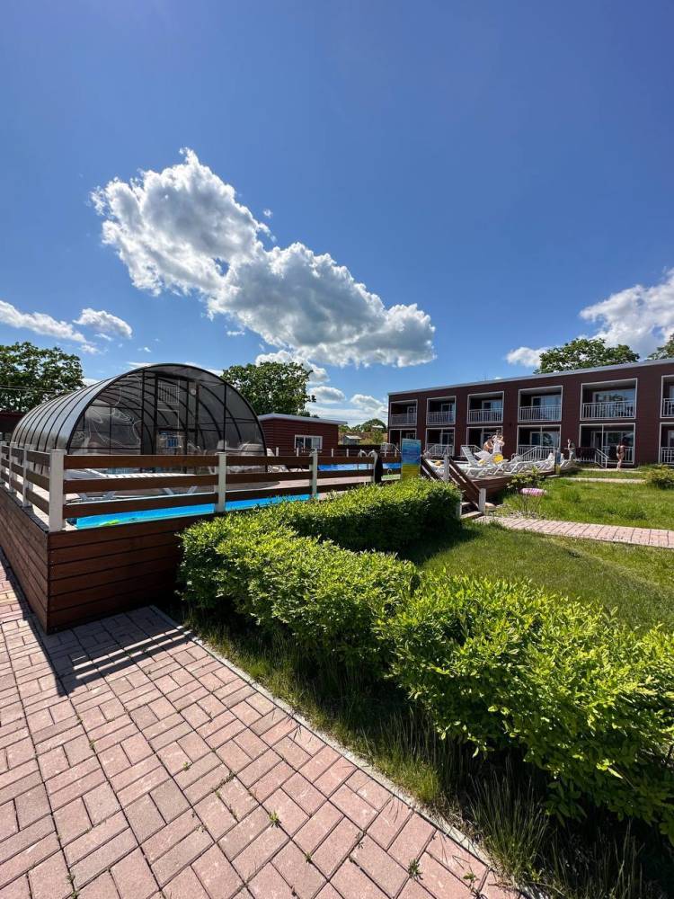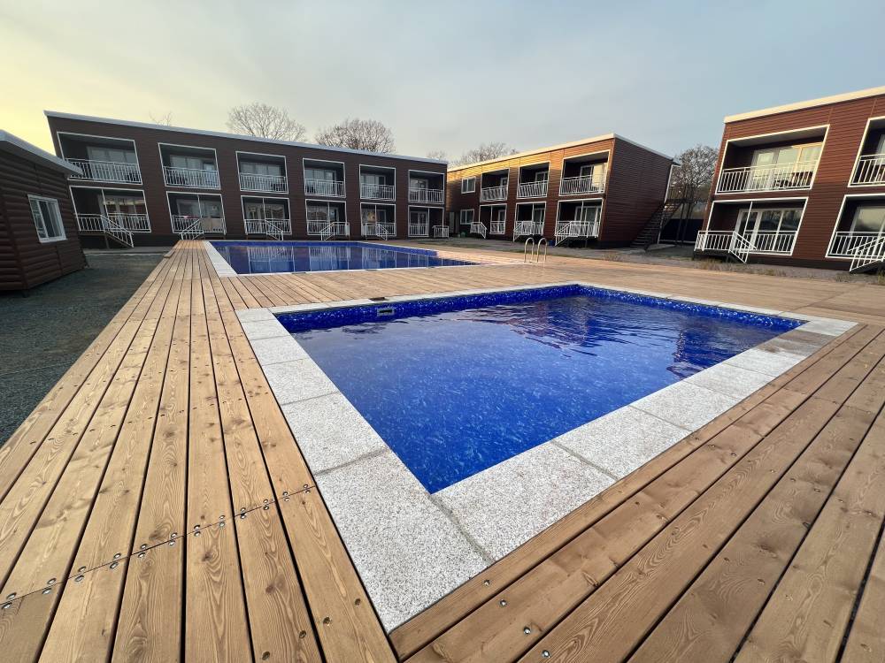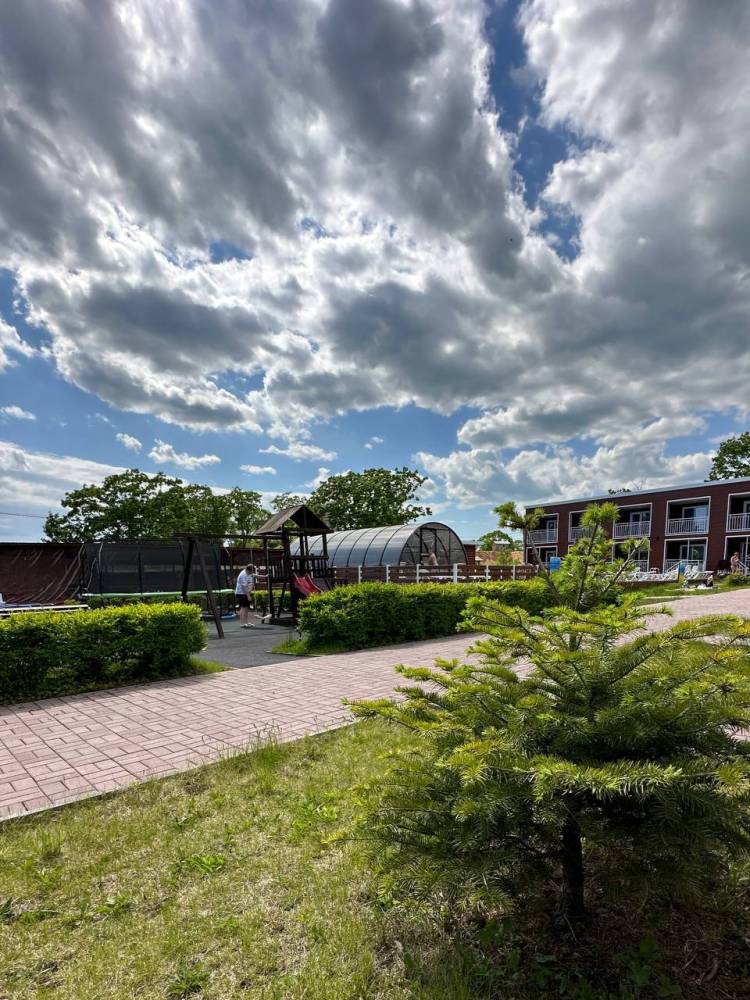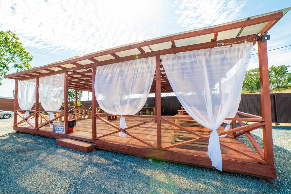 На территории есть парковка, детская и спортивные площадки, бассейны с подогревом и зона отдыха с шезлонгами, русская баня на дровах, банный чан, мангальная зона и оборудование для розжига (решетки, розжиг, уголь за отдельную плату), возможна аренда сапов и велосипедов.