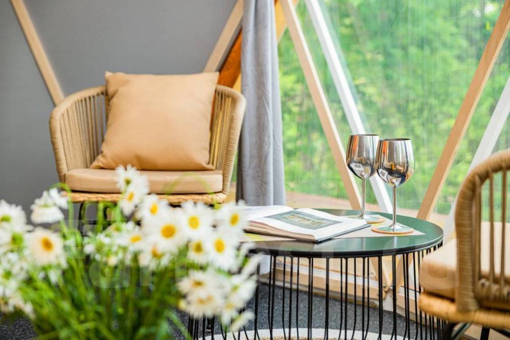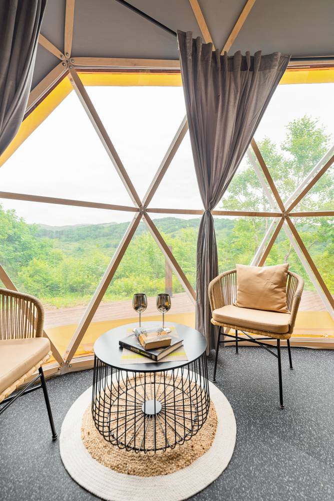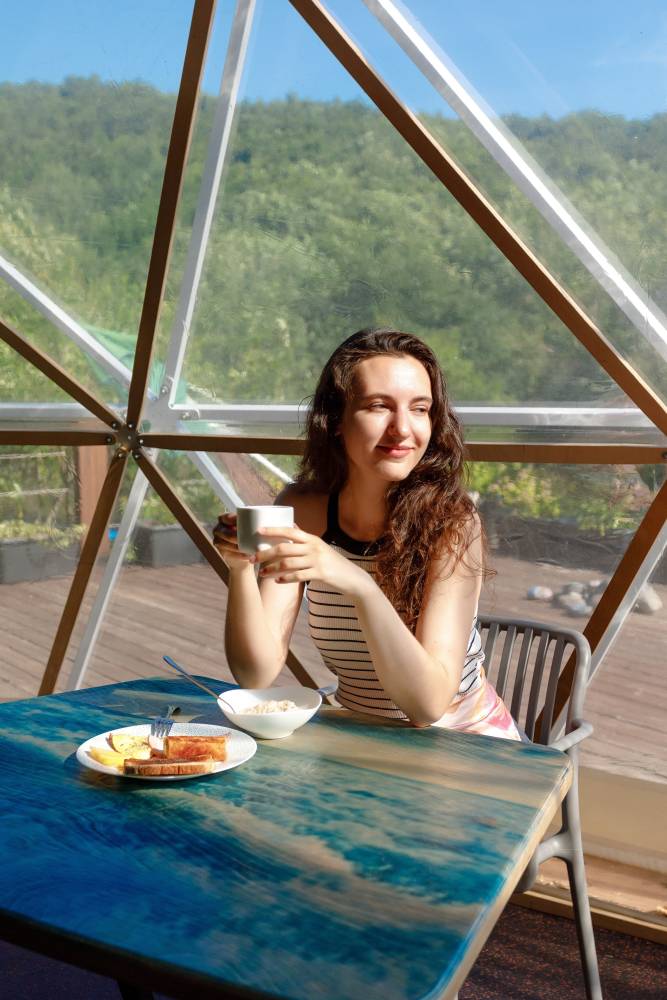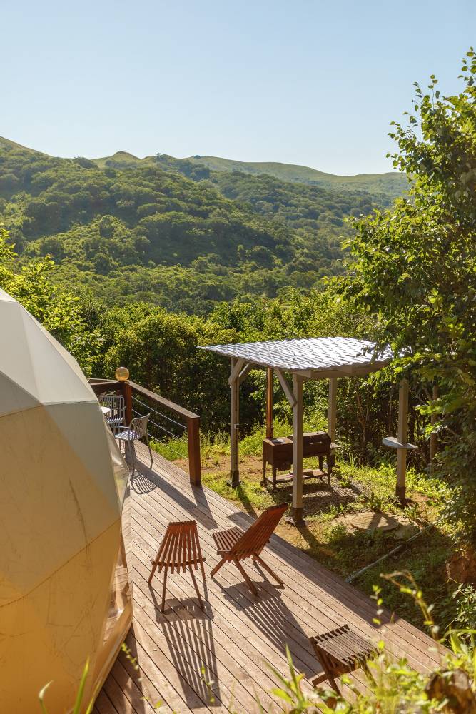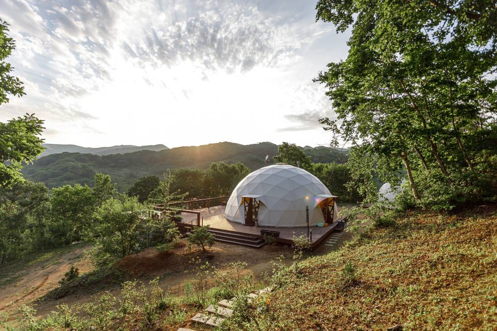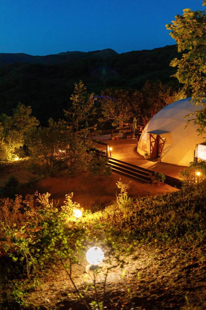 Купол стоит на отдельной террасе с панорамным видом на горы заповедника, в окружении леса.