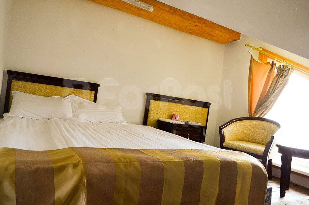 Две полутораспальные кровати, 2 односпальные кровати, тумбочки, столик, стулья. В гостиной: журнальный столик, комод, зеркало, телевизор, холодильник, вентилятор(по требованию).