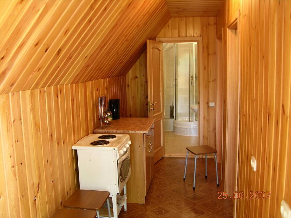 На этаже две раздельные комнаты (по две односпальных кровати, шкаф, тумбочка, раскладушка), санузел (душевая кабина, туалет, раковина), место для приготовления пищи (стол, плитка с духовкой, вся посуда и столовые принадлежности), вода горячая и холодная, смена постельного белья.