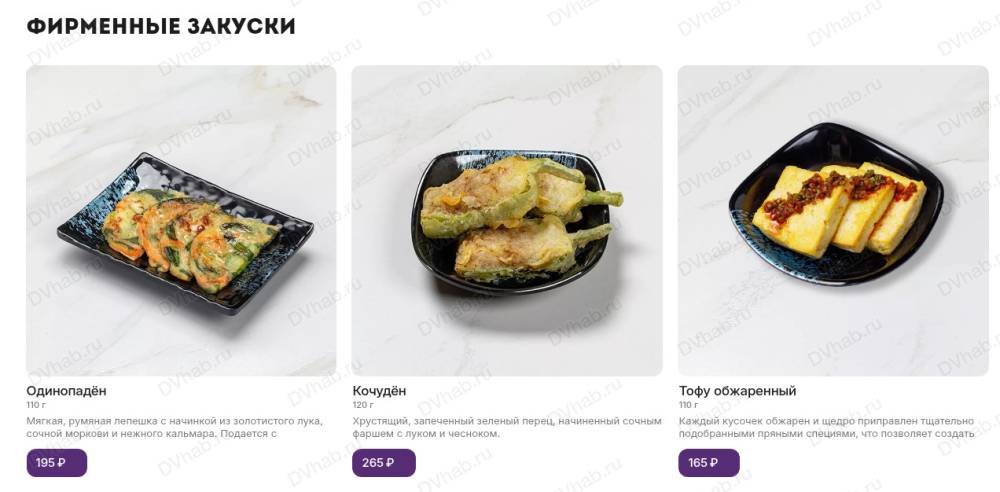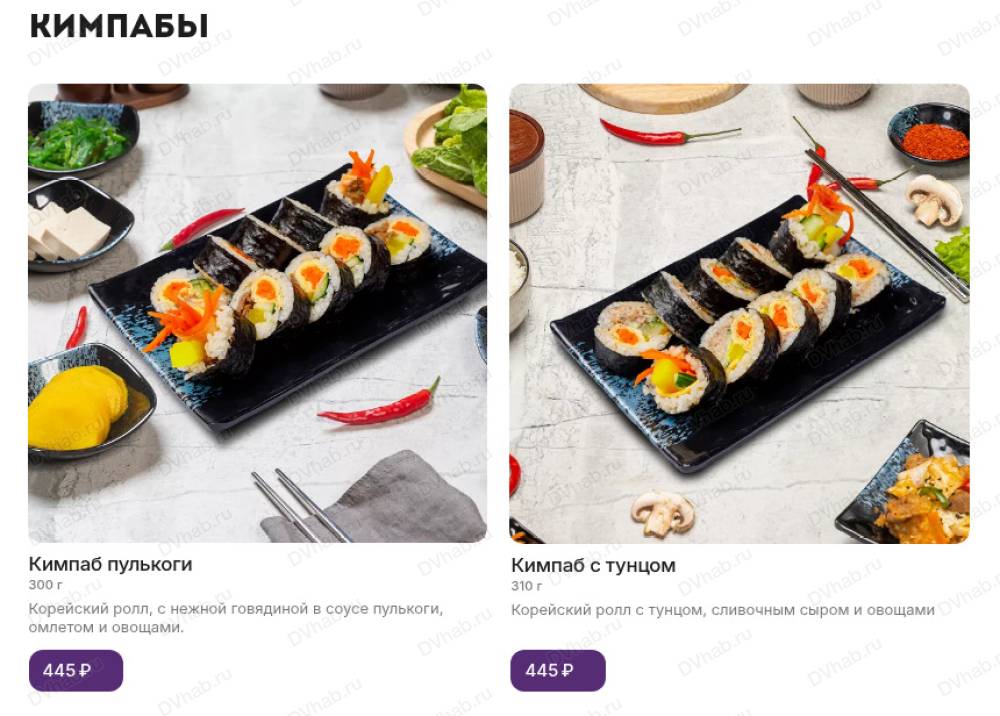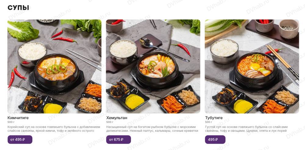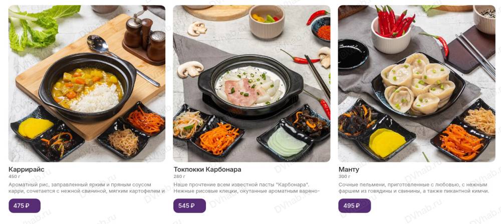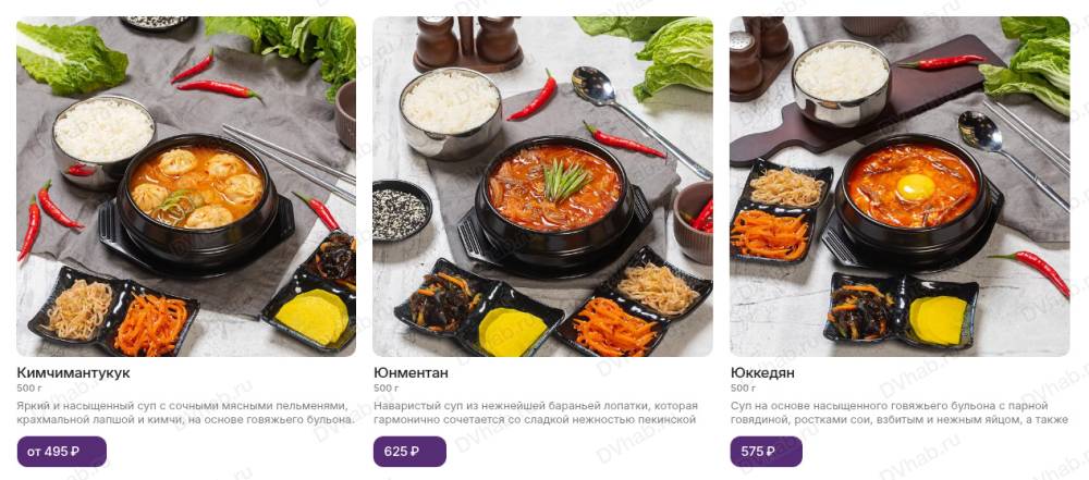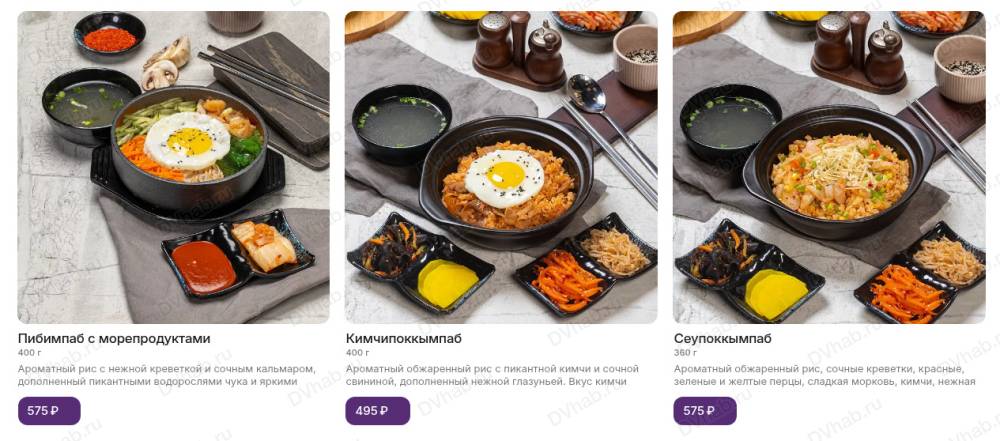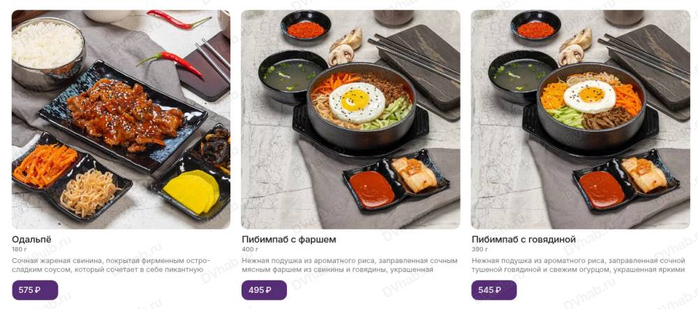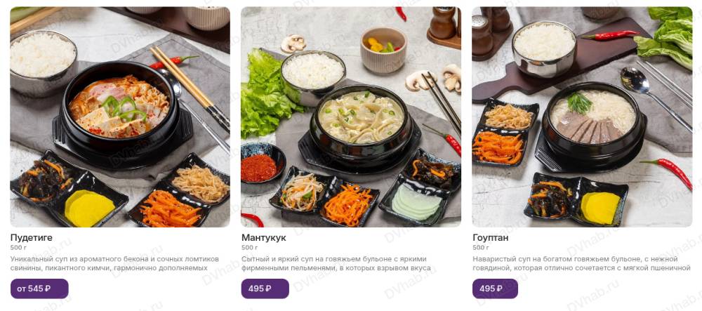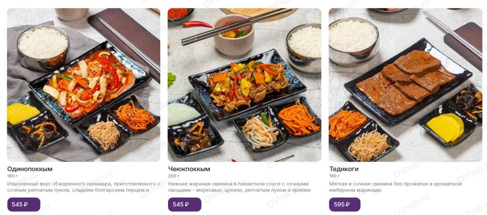 Основное блюдо сопровождает набор пикантных закусок "панчан" собственного производства и порция белого рассыпчатого риса, приготовленного на пару. Повара начинают готовить сразу после заказа.