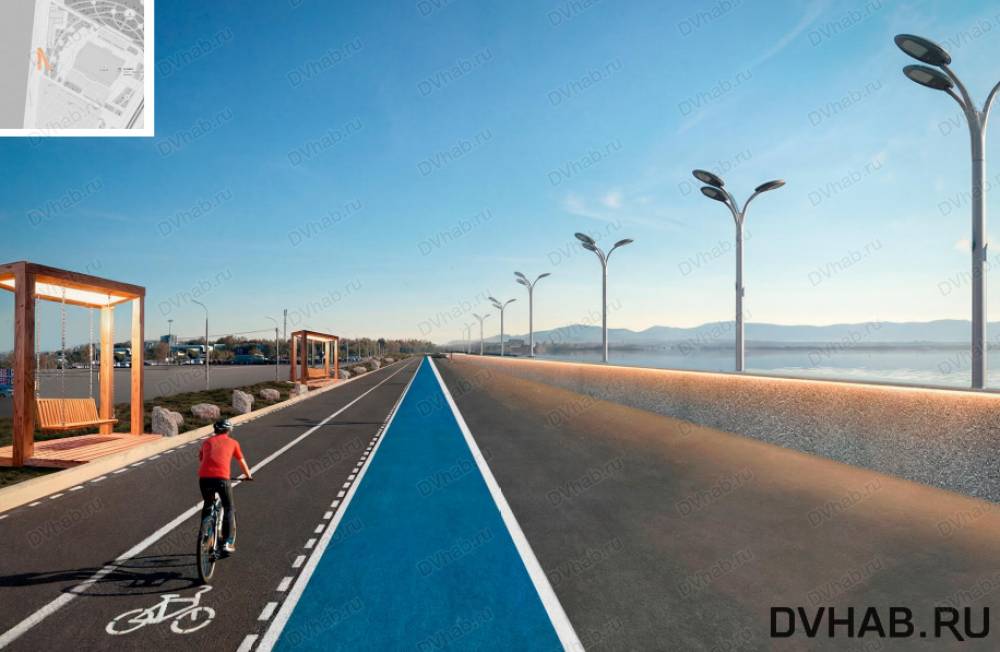 Протяженность 9 км. Она будет состоять из пяти частей, где первая – Центральная набережная от Яхт-клуба до Уссурийского бульвара, рядом с которым расположен речной вокзал, вторая – музейная набережная в районе нового здания Дальневосточного художественного музея, третья – в районе территории бывшей ремонтно-эксплуатационной базы флота, на месте которой появится новая жилая застройка "Городская гавань". Четвертая часть – набережная у арены "Ерофей" – там благоустроят дамбу и разобьют парк. Пятая – набережная Парка пяти ландшафтов, которая станет витриной живописных природных ландшафтов Хабаровского края.
