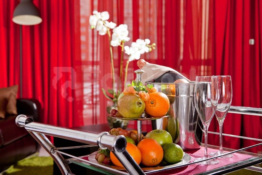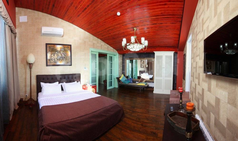 Кондиционер, сейф, холодильник, телевизор, одноразовая продукция (мыло, шампунь, гель для душа, зубная щетка/паста, шапочка для душа, расчёска, ложечка для обуви), фен, полотенца (ножное, ручное, банное), халаты, минибар, прикроватная тумбочка, журнальный, туалетный столик, шкаф для одежды, кресло для отдыха, вешалка и посуда.