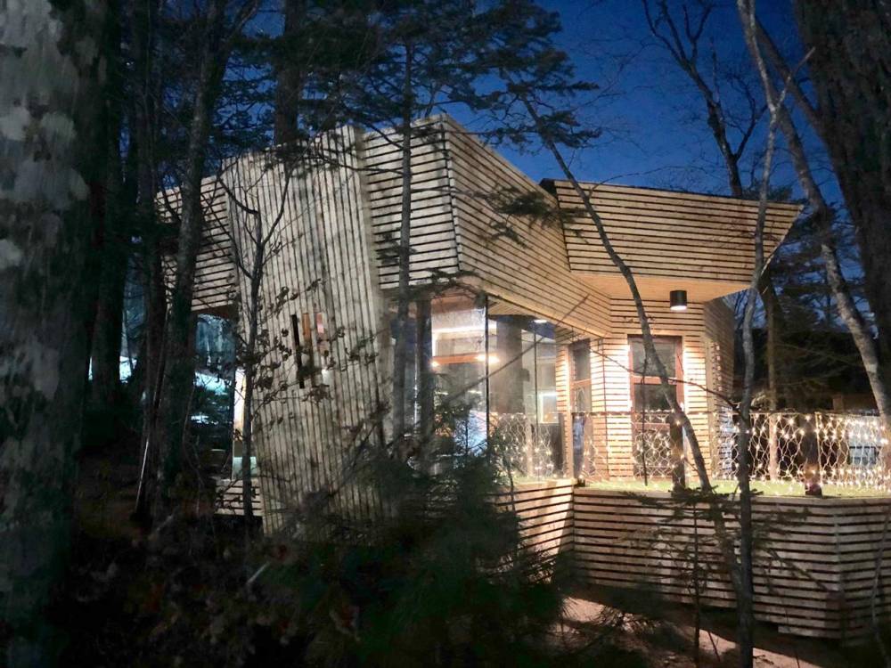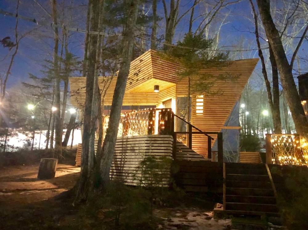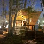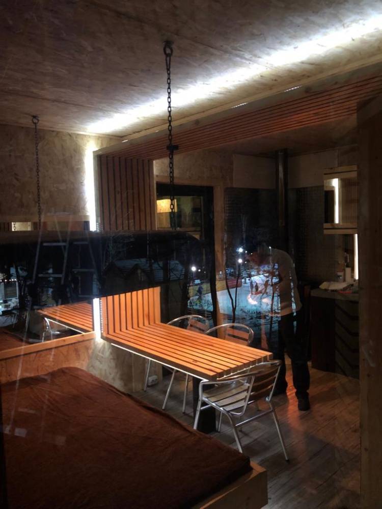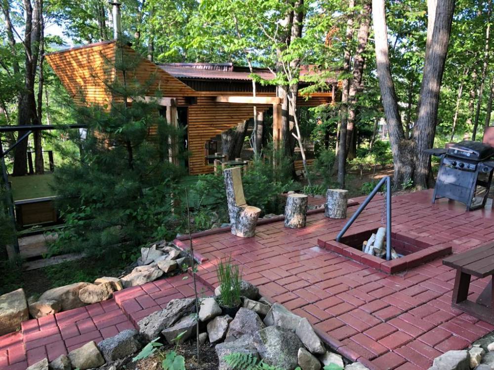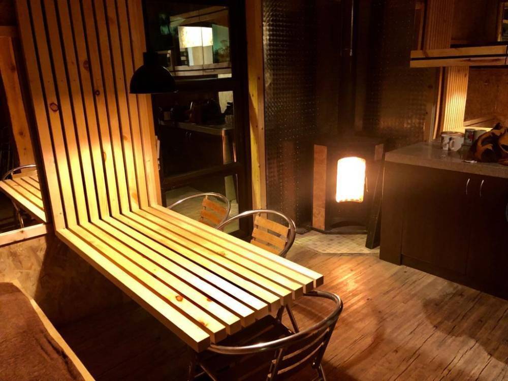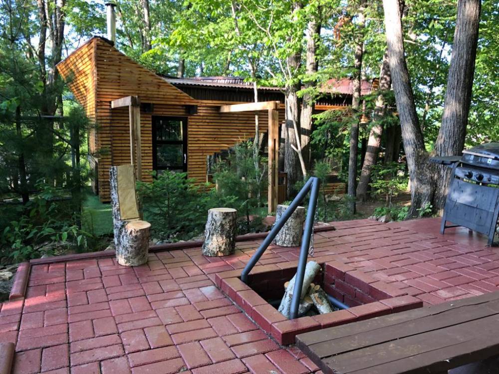 В домике есть электричество, вода (хол., гор.), туалет, душевая кабина, дровяной камин, кухонный гарнитур, 3 кровати, микроволновка, портативная газовая печка, чайник, холодильник и кухонная утварь.