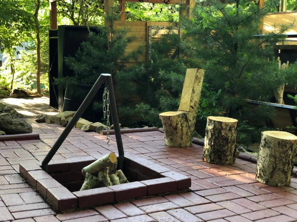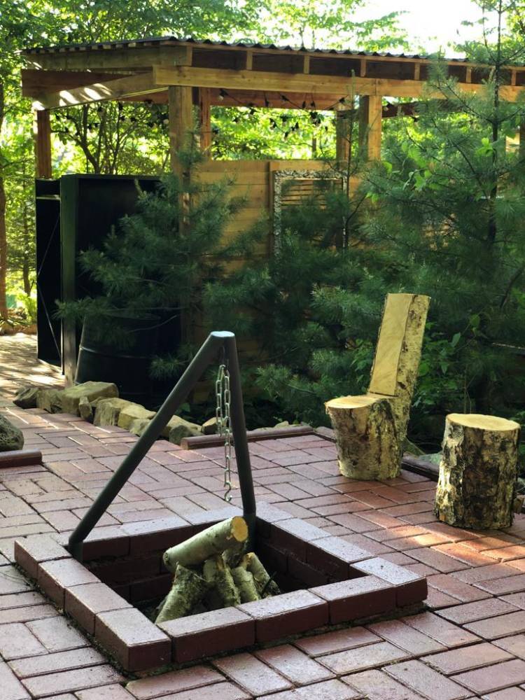 Витражное остекление позволит насладиться природой вокруг. Рядом с домиком расположена мангальная зона, где можно приготовить шашлык.