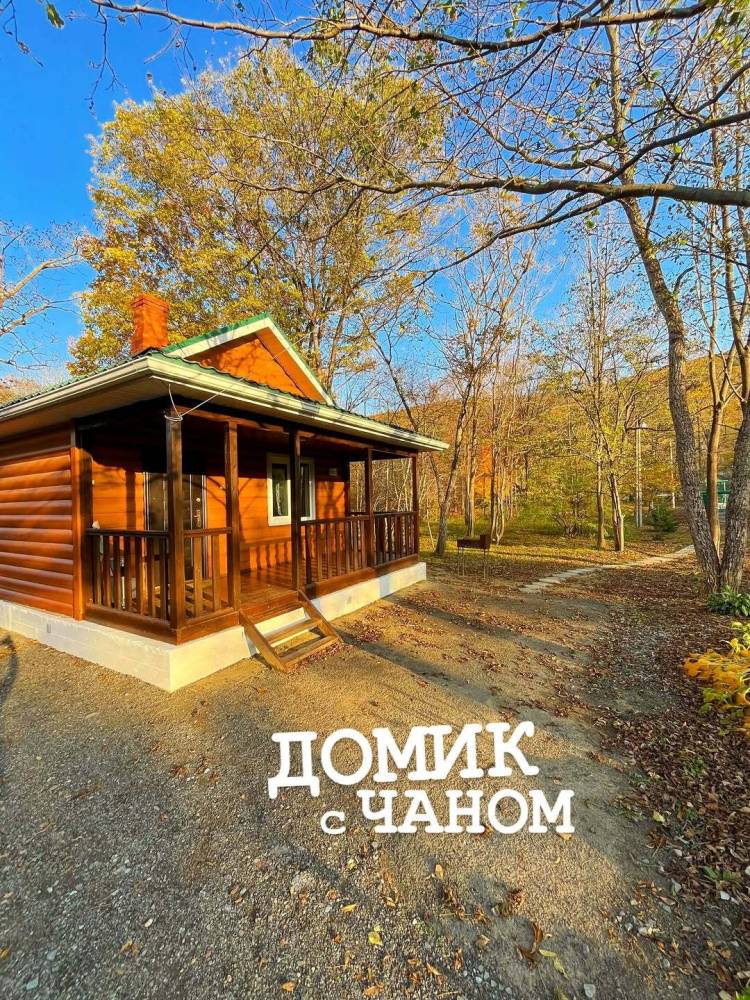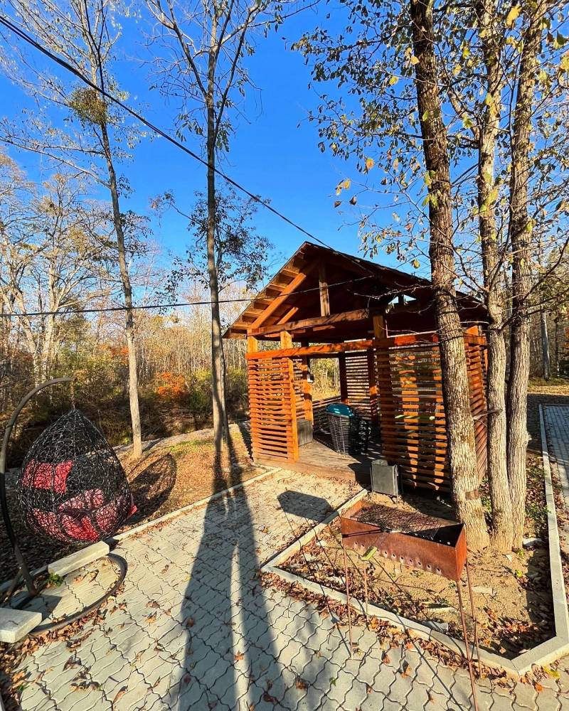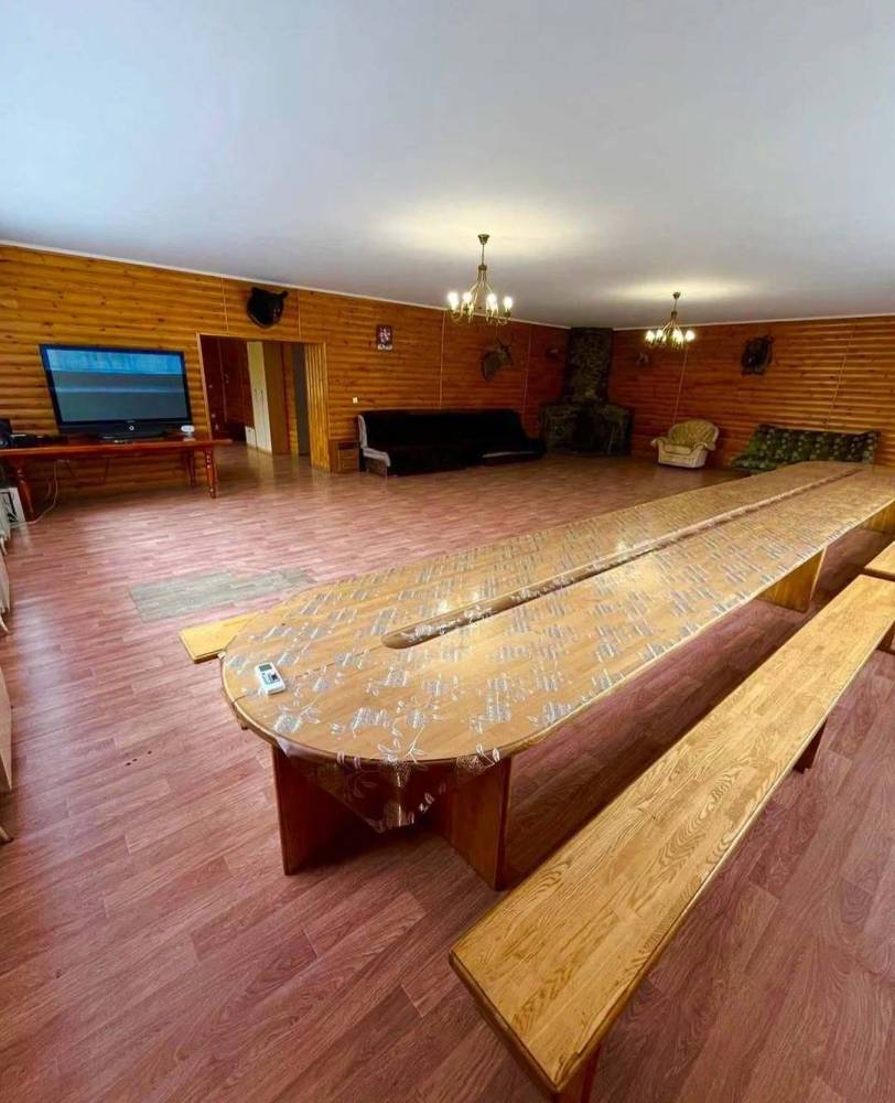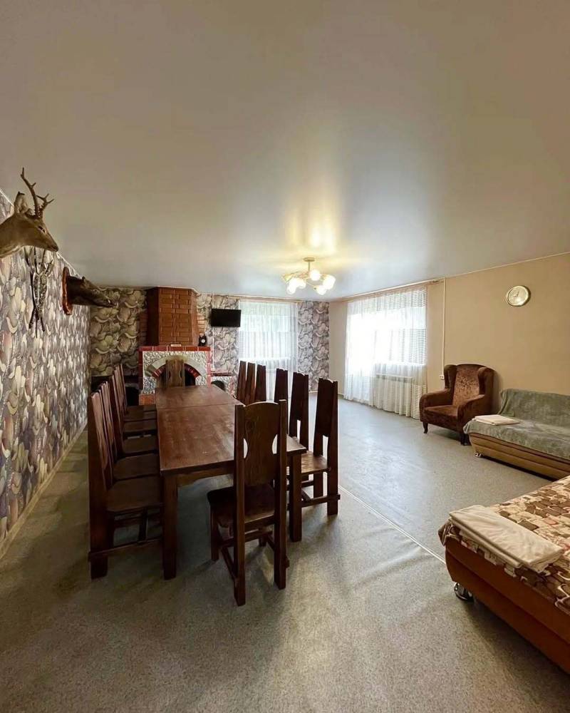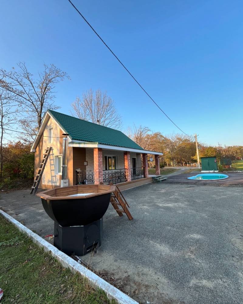 На территории базы отдыха размещен деревянный 10-местный дом. Возле дома есть место для отдыха (столик и мангал).