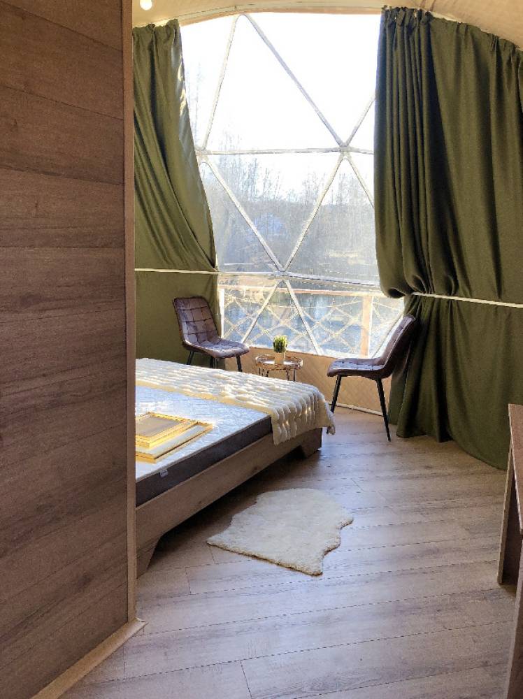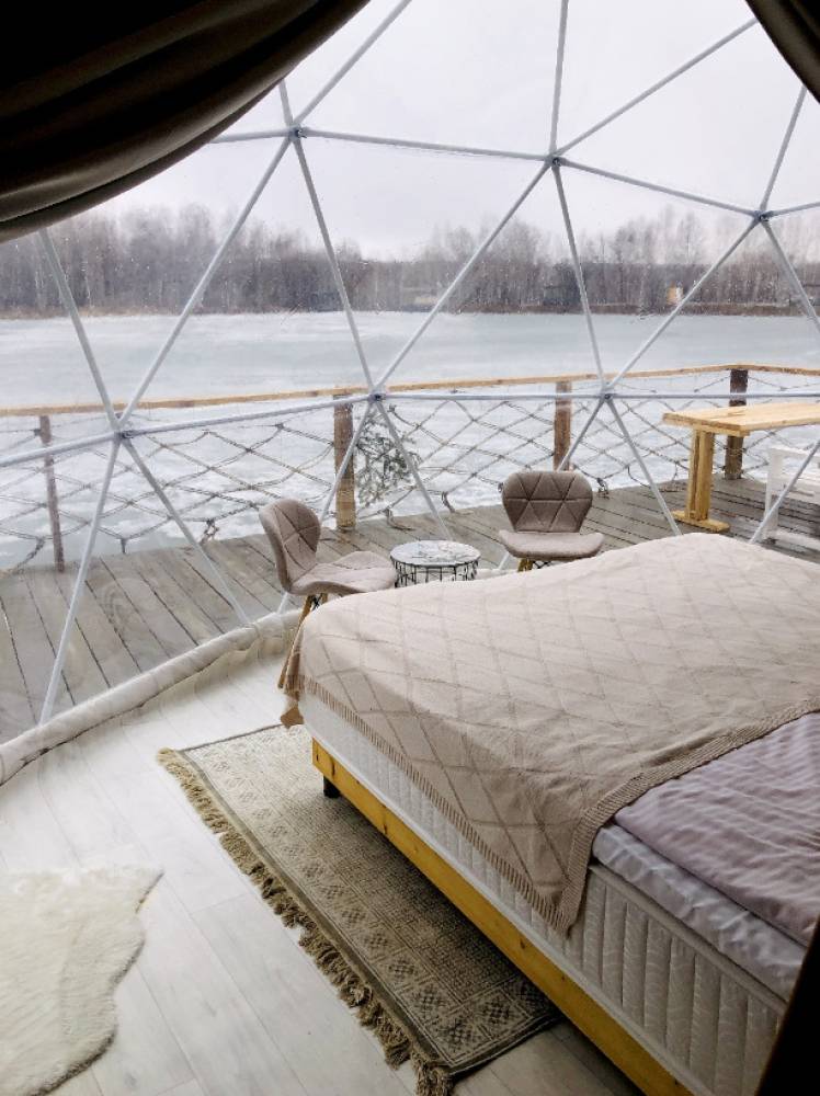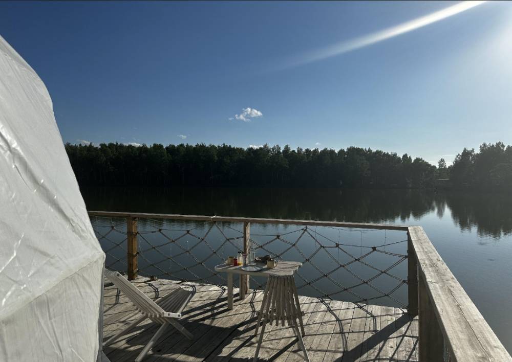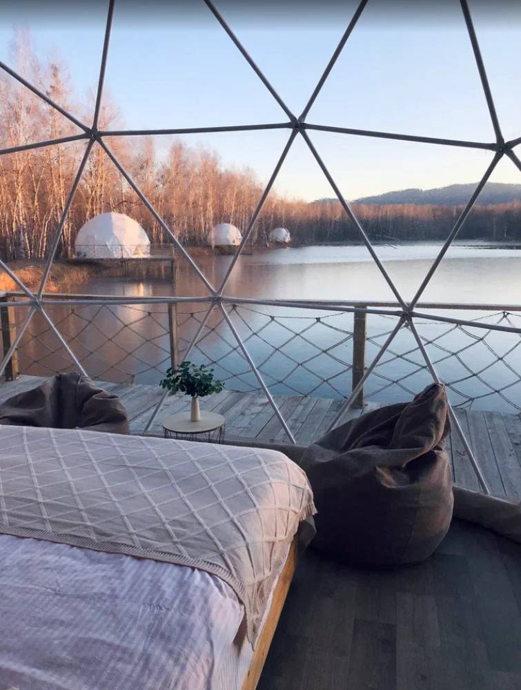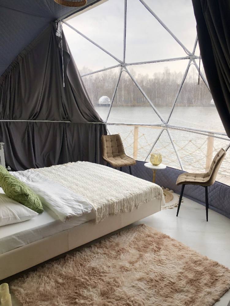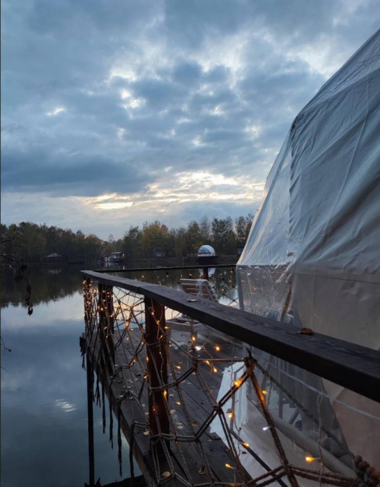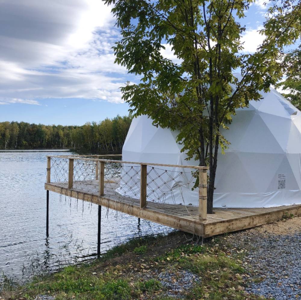 В глэмпинге 9 шатров геокуполов (шале) и на воде, 1 шатер в стиле монгольской юрты в лесу, для пребывания с ночевой. Для дневного пребывания 3 террасы-гриль у воды.
