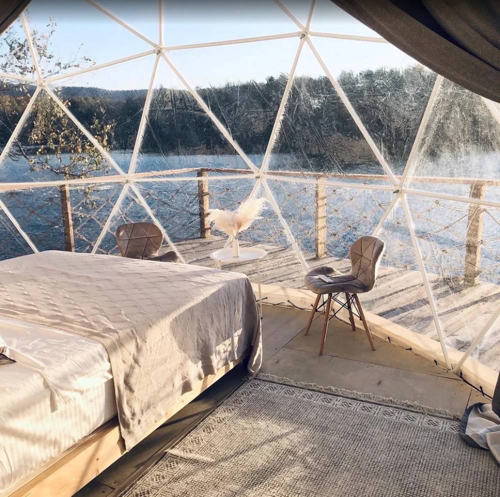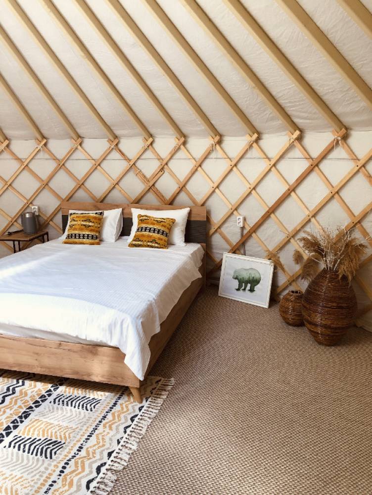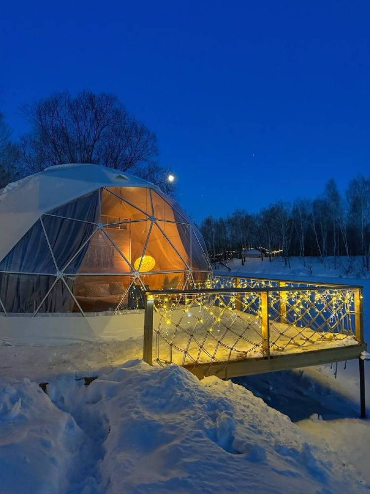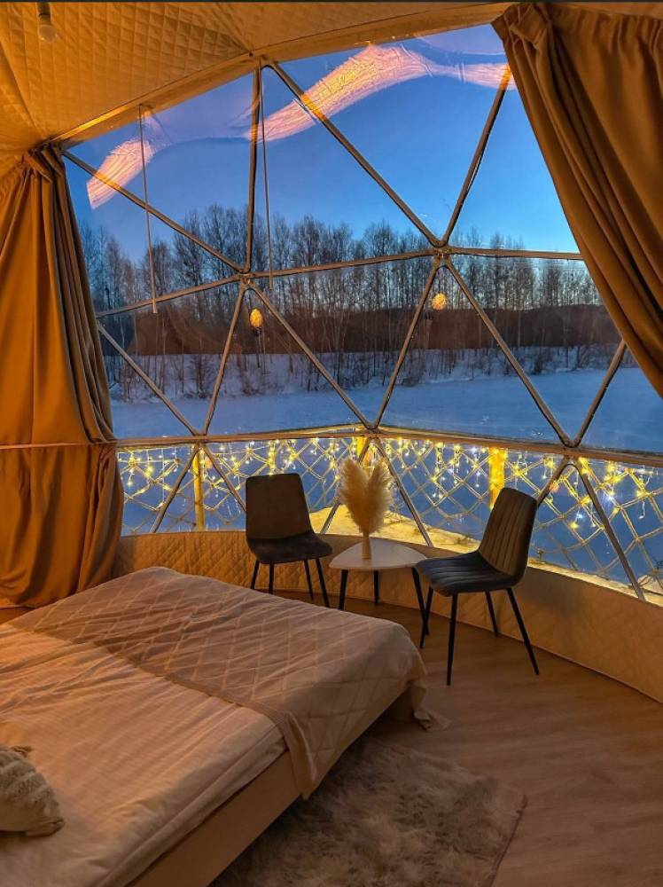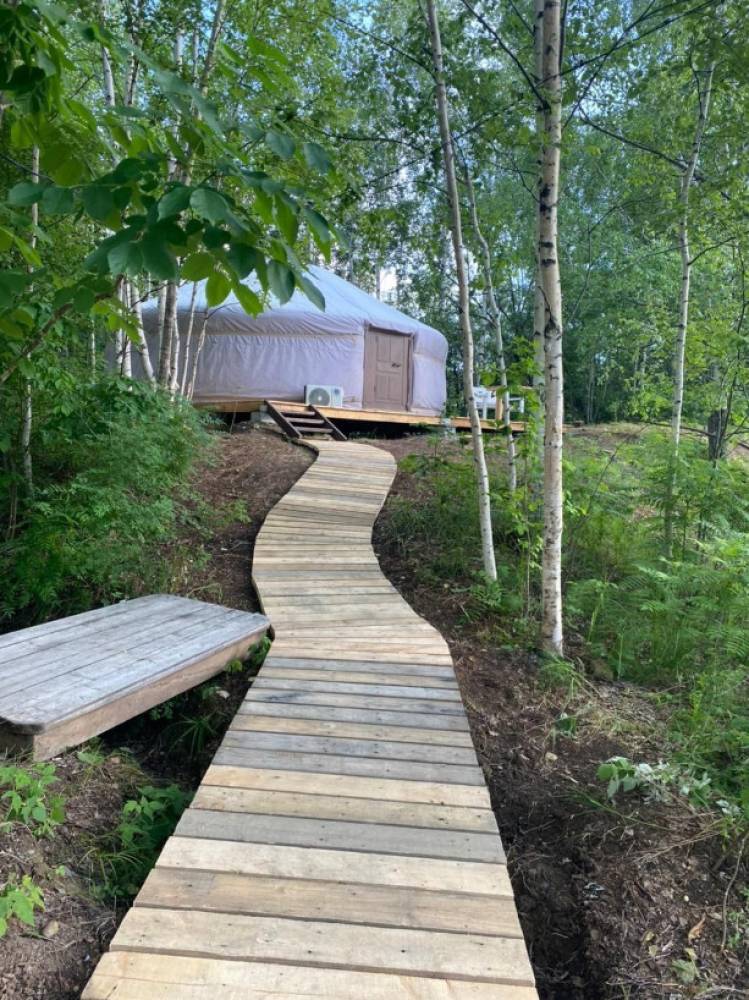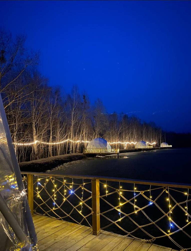 В глэмпинге 9 шатров геокуполов (шале) и на воде, 1 шатер в стиле монгольской юрты в лесу, для пребывания с ночевой. Для дневного пребывания 3 террасы-гриль у воды.