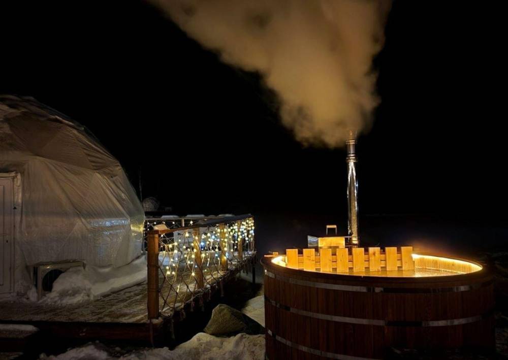 Шатер имеет свою террасу и гриль-зону (мангал, 1, 5 кг углей, розжиг и решетка для жарки входят в стоимость).