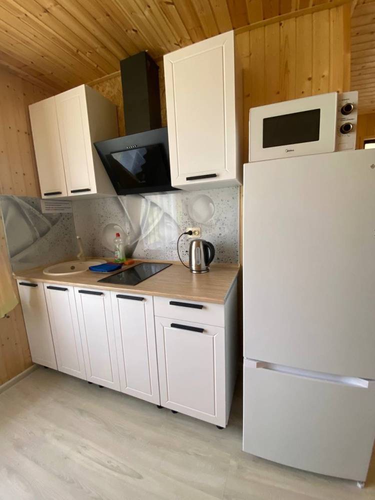 В каждом доме по две спальни (двуспальная кровать и односпальная тахта, место для хранения вещей), туалетная комната (унитаз, ванна, бойлер, электрический полотенцесушитель). Кухня (телевизор, двухкамерный холодильник, плита, посуда, микроволновка, чайник, кухонный гарнитур и диван). Отопление: тёплый пол, дополнительно конвектор.