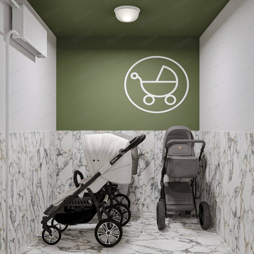 - Колясочные на первом этаже. Больше не нужно постоянно поднимать тяжелую детскую коляску на этаж, ее можно хранить в безопасной и удобной выделенной зоне.